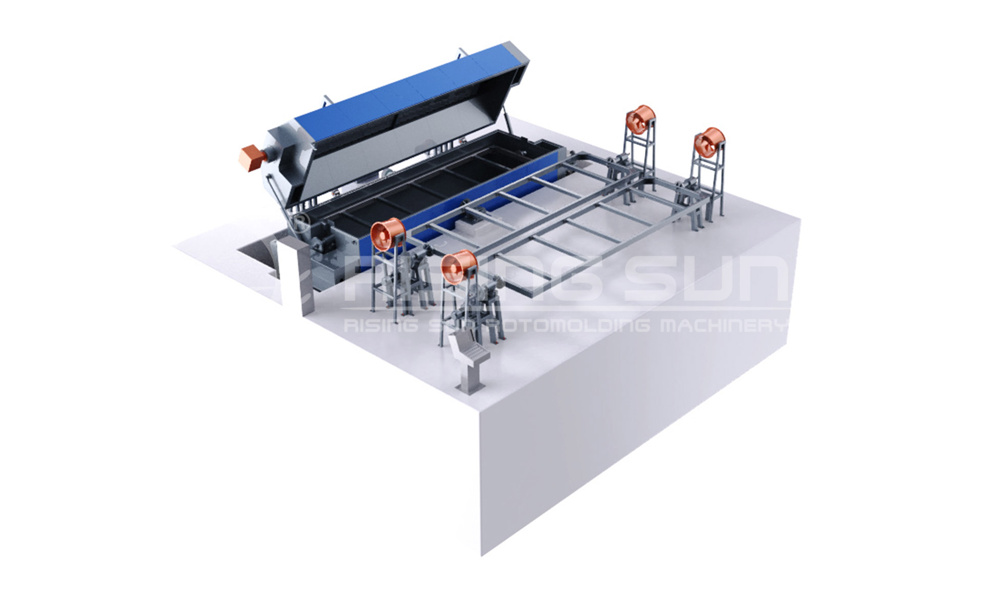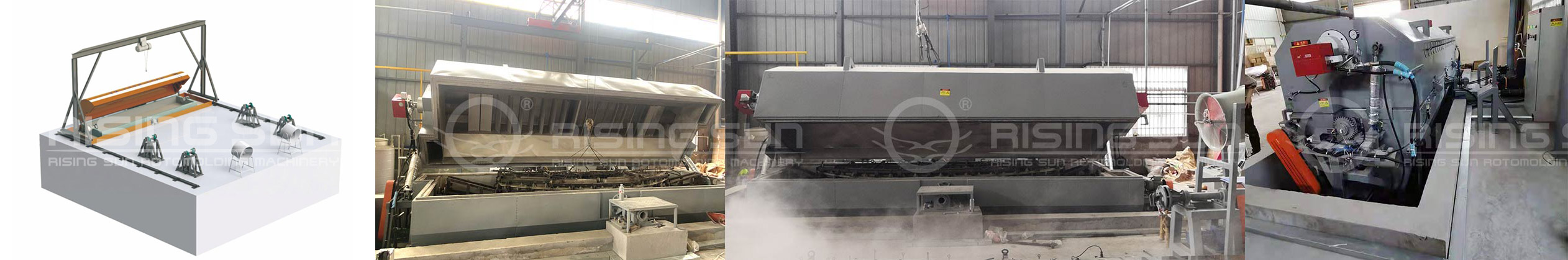 優(yōu)勢(shì): 1、節(jié)省能源,提高生產(chǎn)效率 2、可采用不同燃料的燃燒機(jī) 3、適合做細(xì)長(zhǎng)的滾塑產(chǎn)品,如皮劃艇等。 4、觸摸屏操作,半自動(dòng)化控制