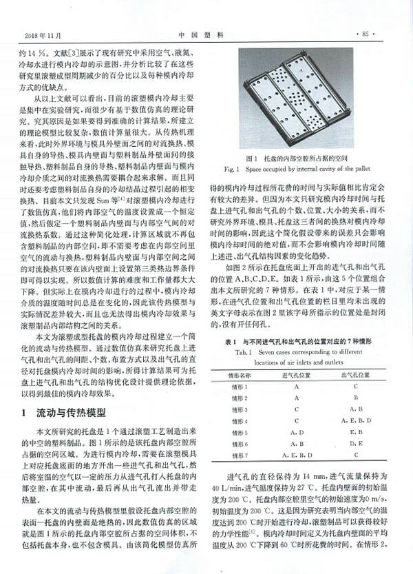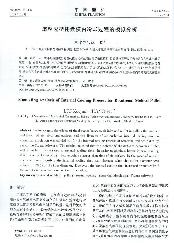 2018年11月,北京工商大學(xué)劉學(xué)軍教授和我司江輝在《中國(guó)塑料期刊》11月刊發(fā)表了關(guān)于《滾塑成型托盤模內(nèi)冷卻過程的模擬分析》的文章。